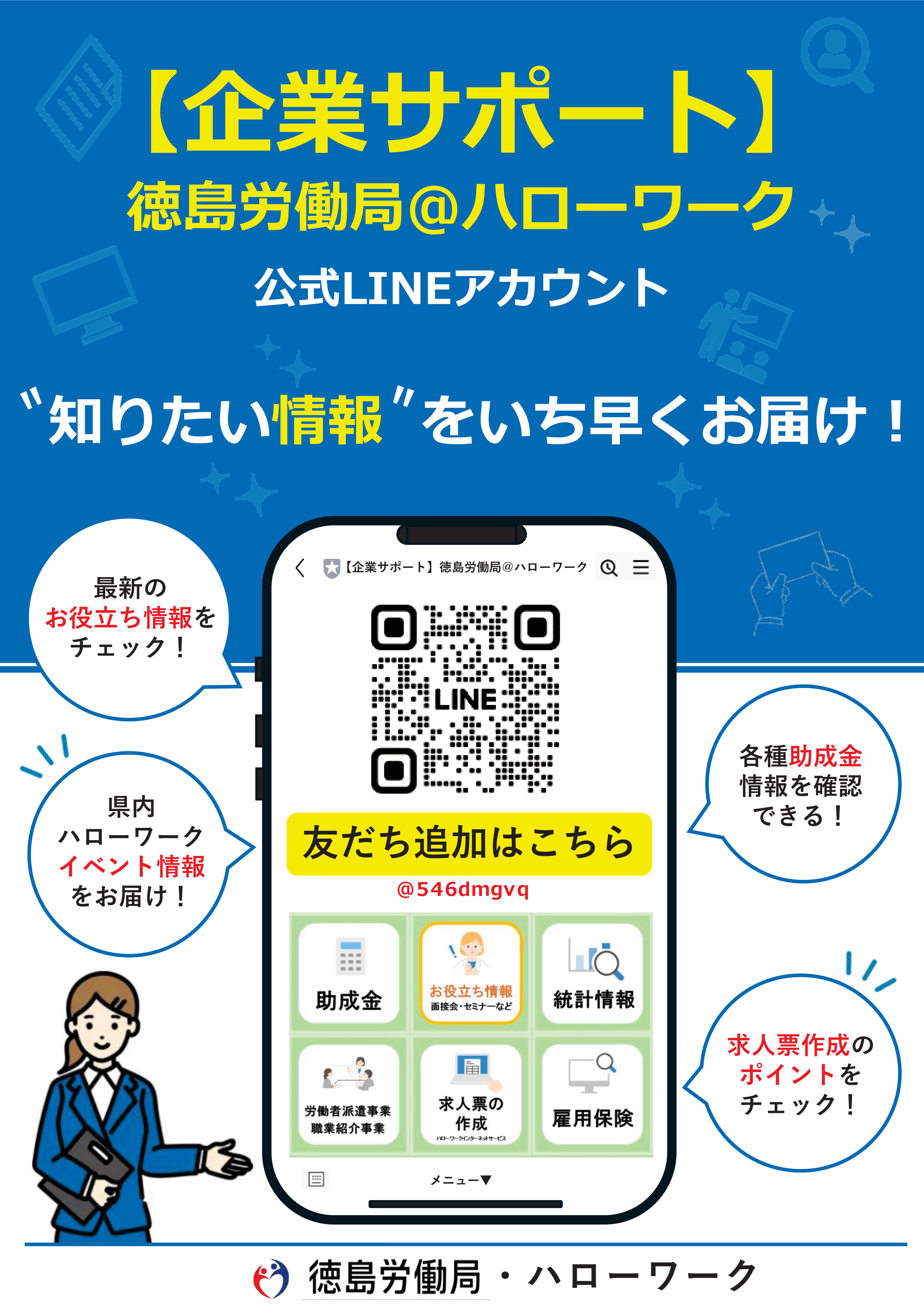 徳島労働局より、企業向け公式LINEアカウント「【企業サポート】徳島労働局@ハローワーク」のご案内がありました。